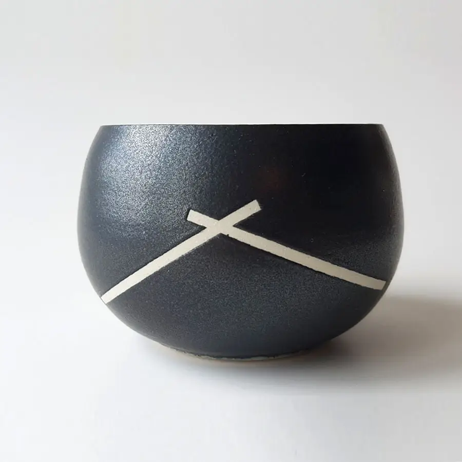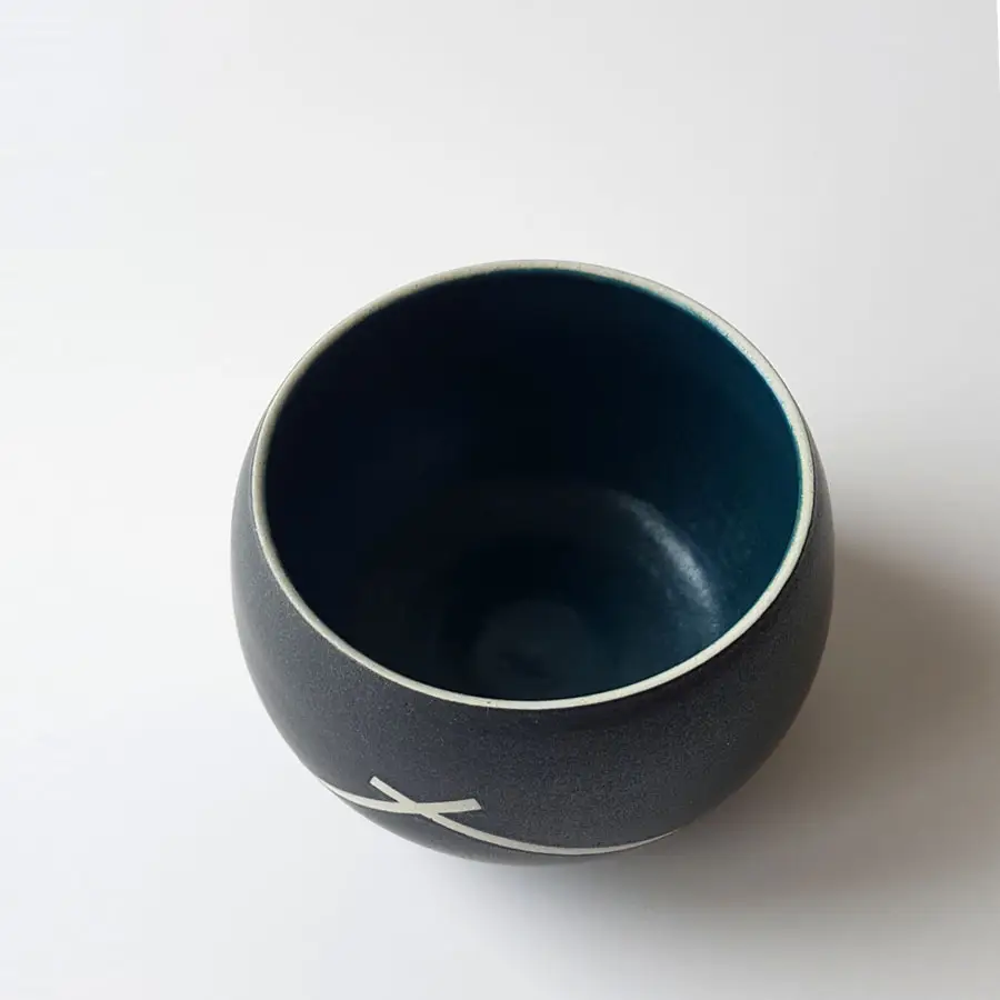 Ce bol boule en grès blanc est unique, sa forme comme deux mains jointes nous conduit au geste initial qu’est de boire dans ses mains. L’impression du décor et le jeu de l’émail différents sur chacun d’eux.