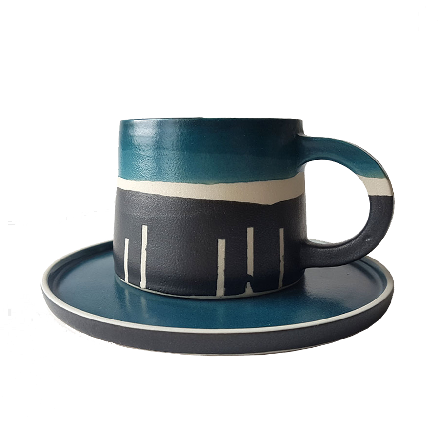 Ensemble né de la manipulation des objets, composé d'une assiette à dessert et d'une tasse petit déjeuné. Travail en terre à grès blanche, passe au lave-vaisselle et micro-onde.