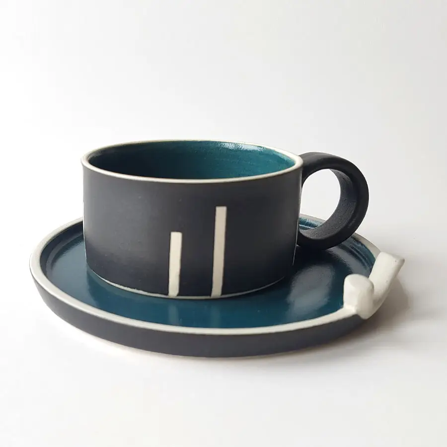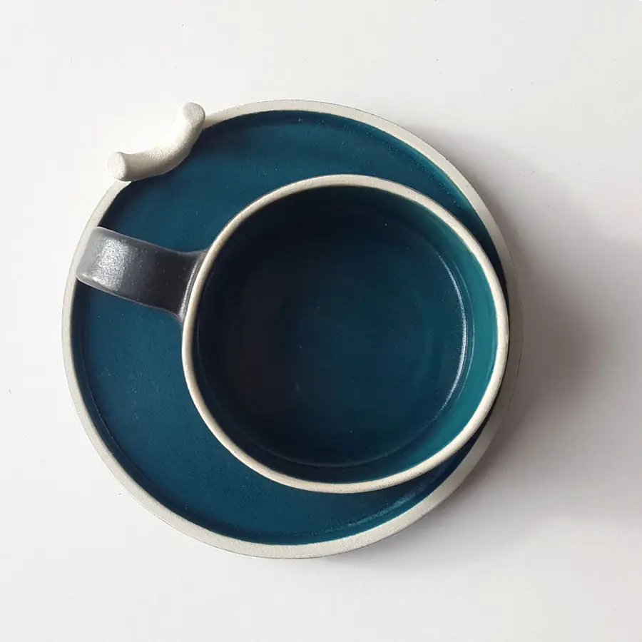 Ensemble en grès blanc, composé d'une tasse et d'une sous tasse, passe au micro-onde et au lave-vaisselle.