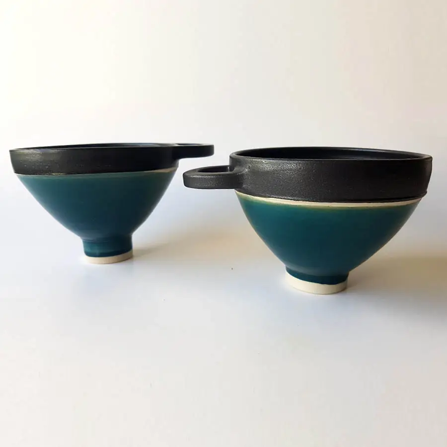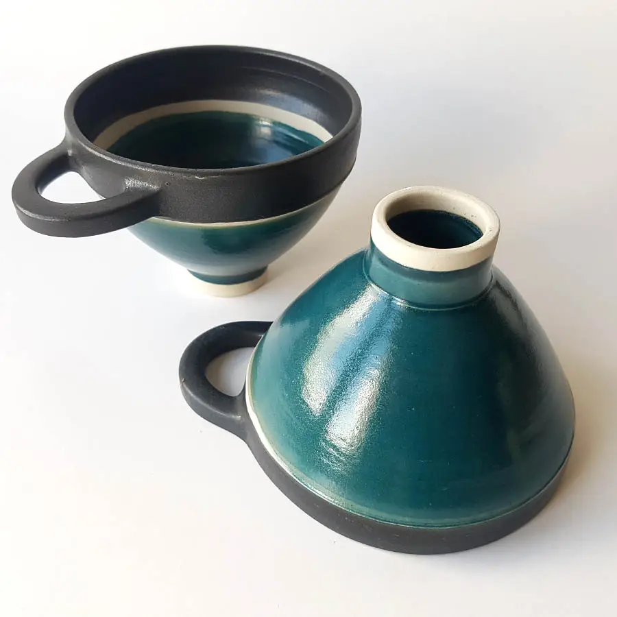 Ces objets sont intégralement réalisés dans mon atelier à partir d'une terre à grès blanche. Les émaux sont conçus par mes soins à partir de matières premières naturelles, chaux, kaolin, néphéline syénite, cendre de lavande …